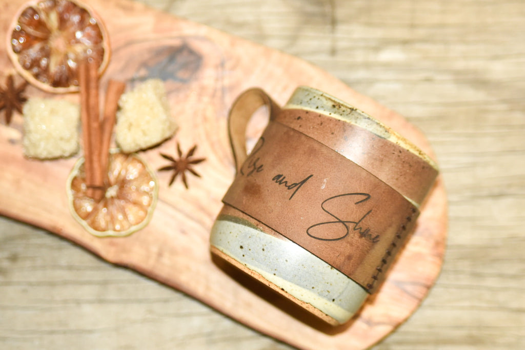A cozy, handmade mug wrapped in leather makes a wonderful gift for that special someone. Etched with 'Rise and Shine', this unique mug will be the perfect morning coffee companion. Featuring our best selling 'Coconut' colorway. Very limited availability!
