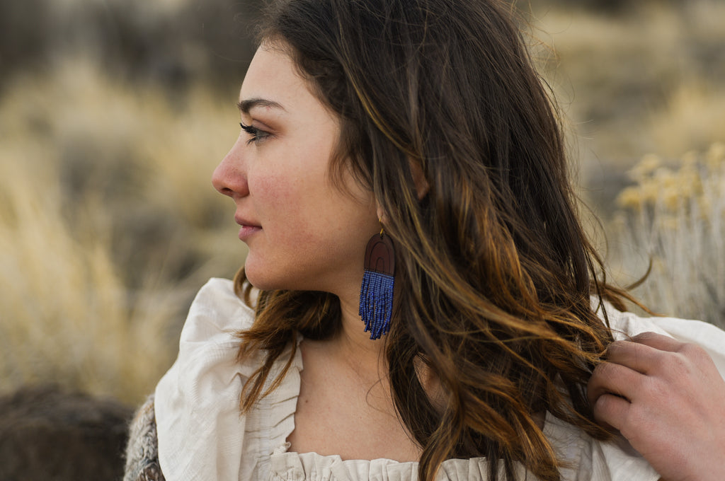 Beautifully coordinated with our Timberline Slouch and our Timberline Hip Purses, these are the Cascade Cobalt Leather+Beads earrings. These are accented with the etched Cognac leather and a cascade of cobalt blue colored beads to give them the perfect amount of movement in the fringe.