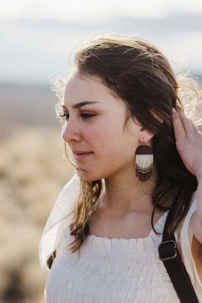 Beautifully coordinated with our Timberline Slouch and our Timberline Hip Purses, these are the Scarlet Sunset Leather+Beads earrings. These are accented with the Tobacco leather and a cascade of colorful beads to give them the perfect amount of movement in the fringe.